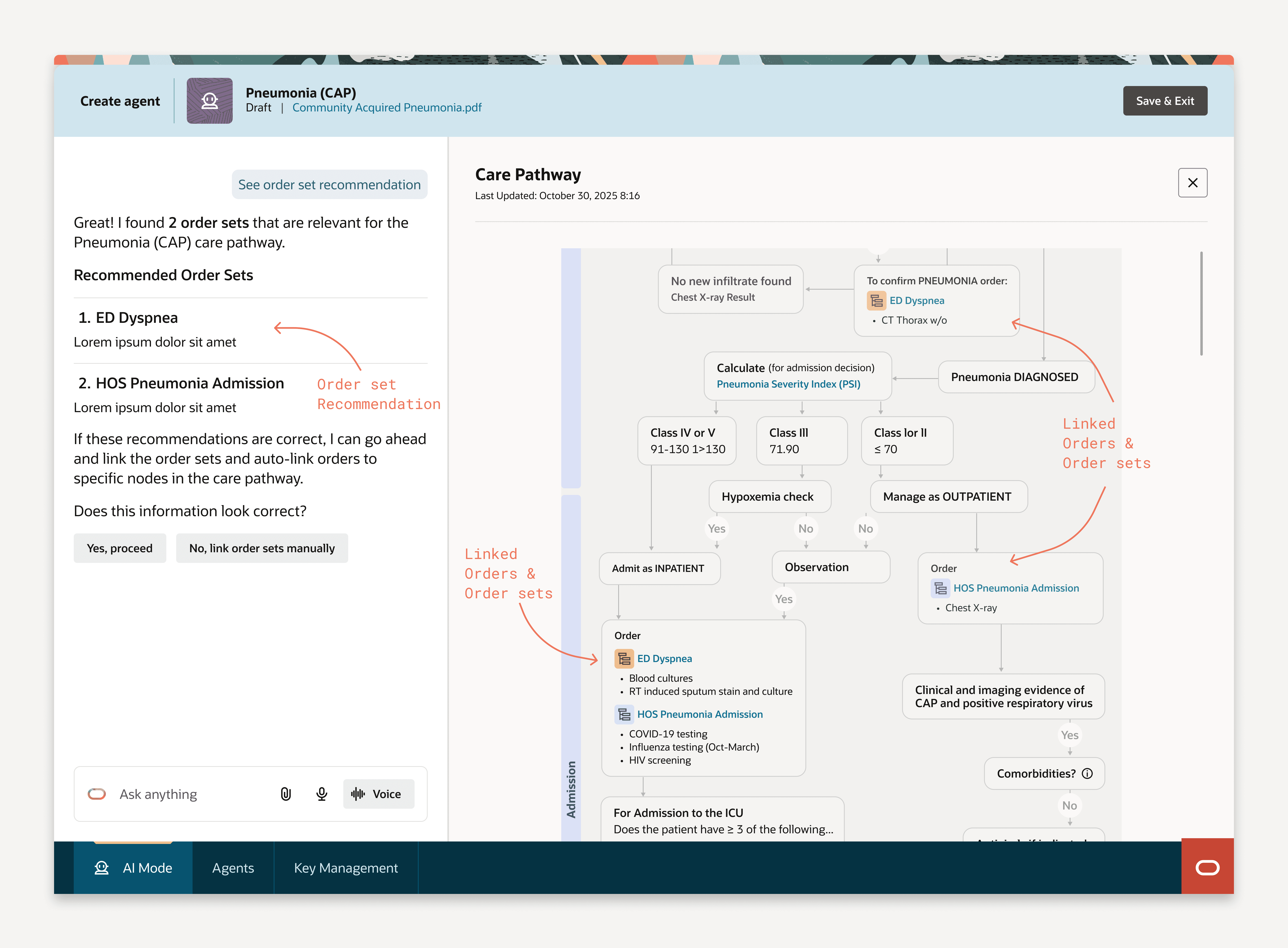 Phase 1 flowcharts reference order sets as text labels — the agent can read them but can't act on them. Phase 2 makes them executable: the agent can initiate an order set when a patient reaches the relevant node in the pathway. Rather than asking informaticists to manually locate and link every order set, the AI recommends them in the conversation panel, explains its node-placement reasoning, and auto-links on acceptance. The same Canvas+Conversation principle that works at the bedside on mobile works in a clinical authoring environment on desktop.