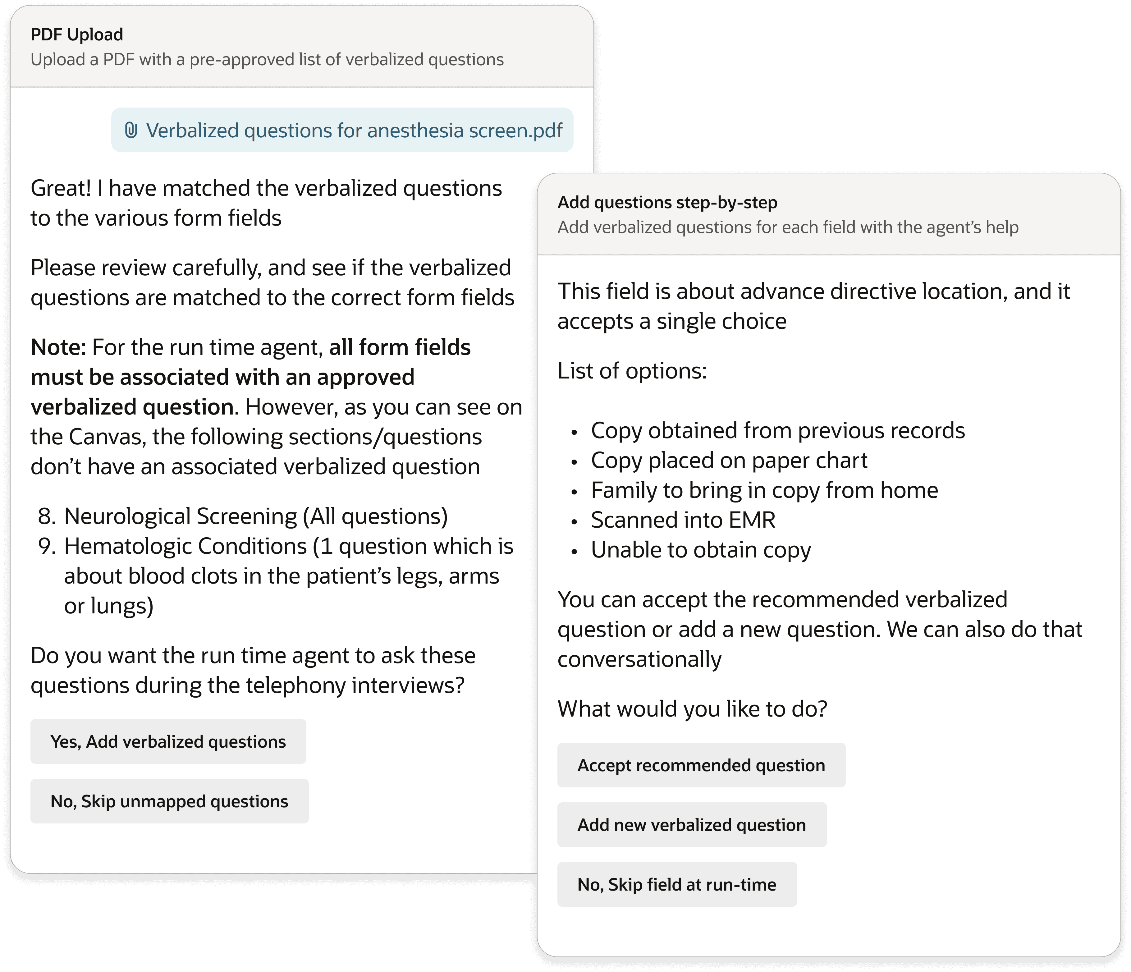 Nurses with an existing document of verbalized questions can upload it — SAB maps questions to fields and proactively flags unmatched ones, asking whether to add questions manually or skip those fields. Nurses who prefer to work field by field can tap a quote icon directly on the canvas, or let the SAB agent walk them through section by section conversationally. Both paths produce the same output. The nurse chooses how to get there.