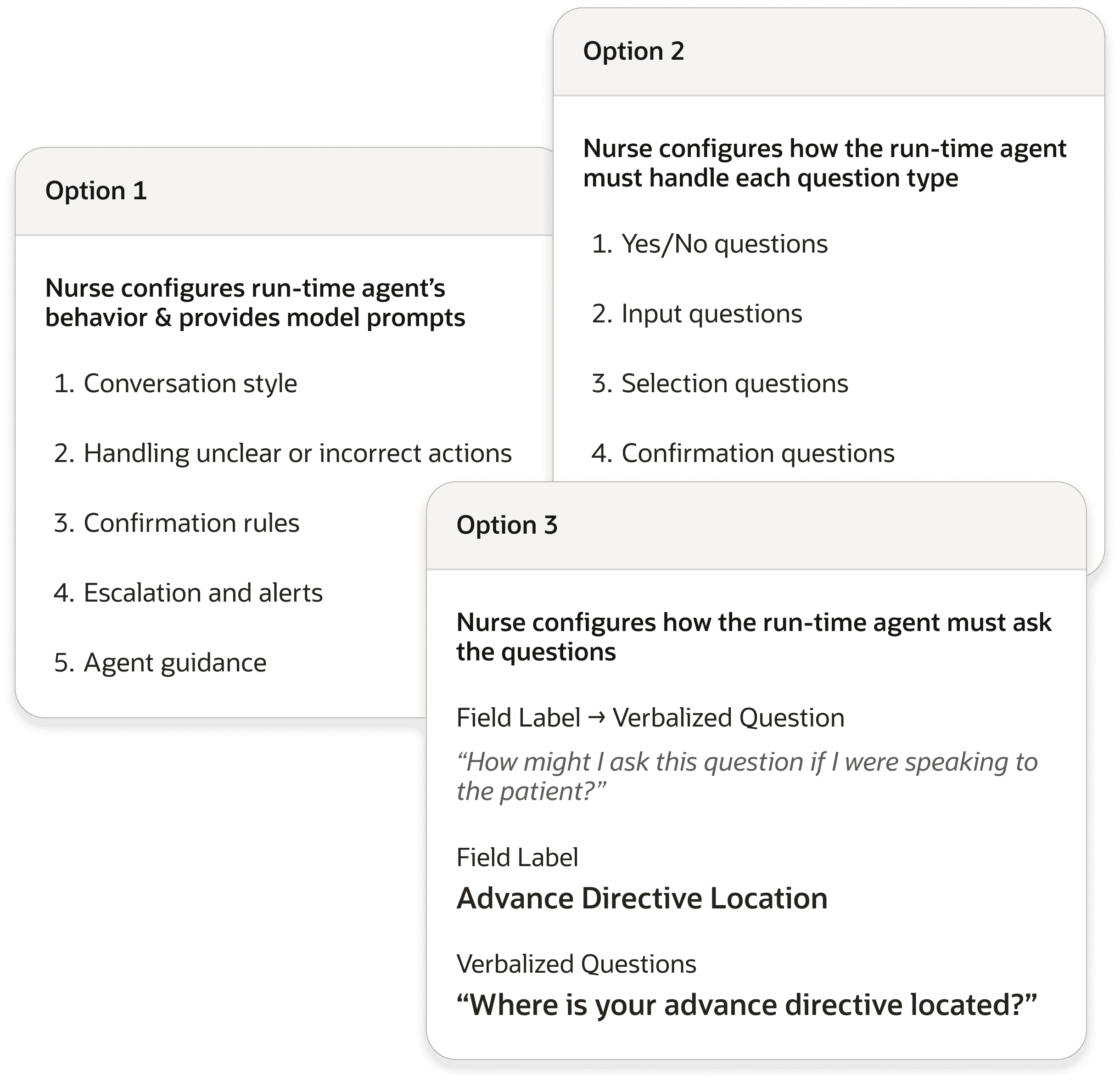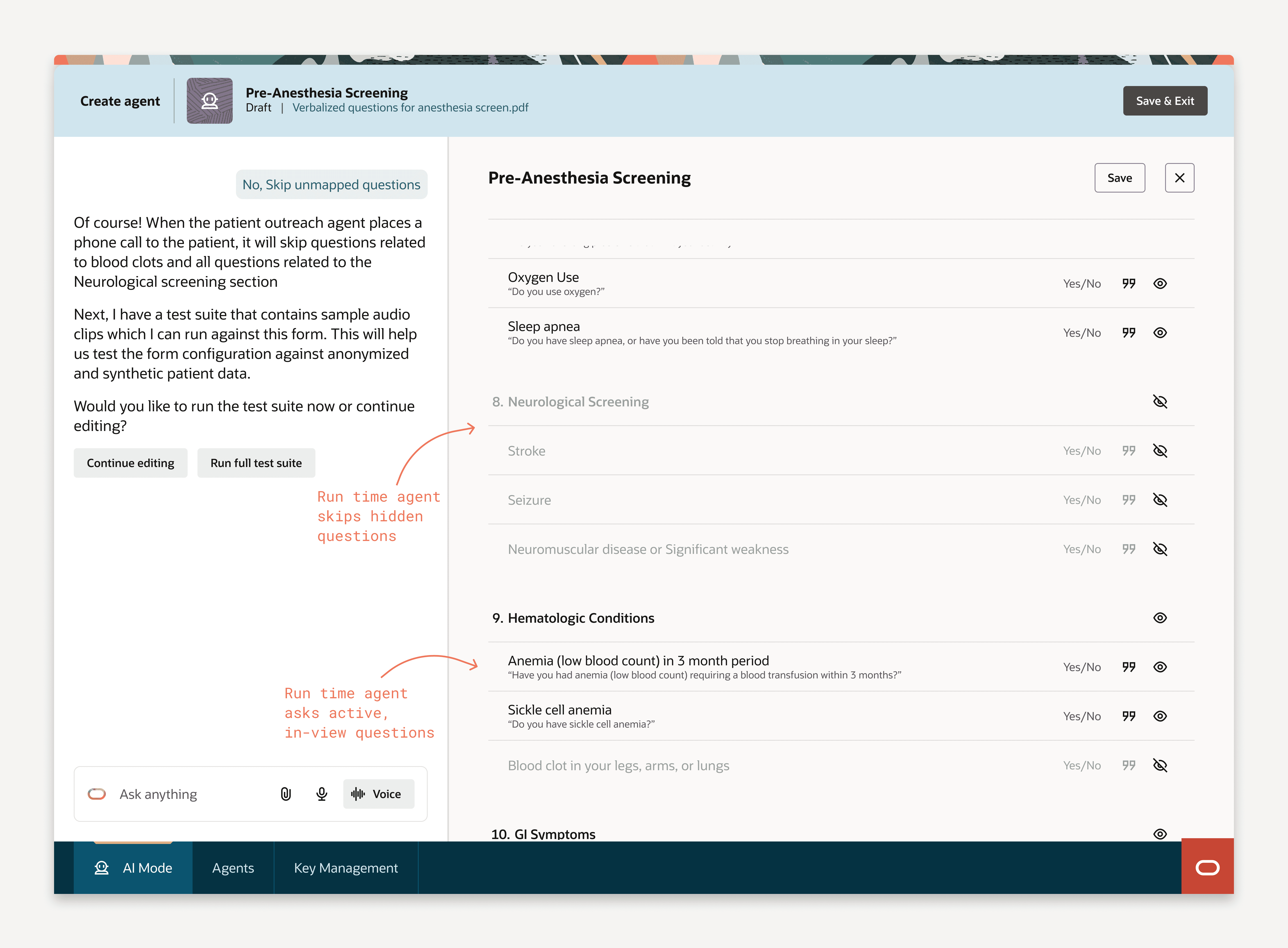 Patient outreach calls are time-consuming, repetitive, and pull nurses away from direct patient care. The agent can make the call — but only if it knows how to ask each question the way a skilled nurse would. A form field labeled "Height" produces an agent that says "Height" to a patient. That's not a conversation. Teaching the agent to ask "What is your height?" — and hundreds of questions like it — is what this design-time experience enables.